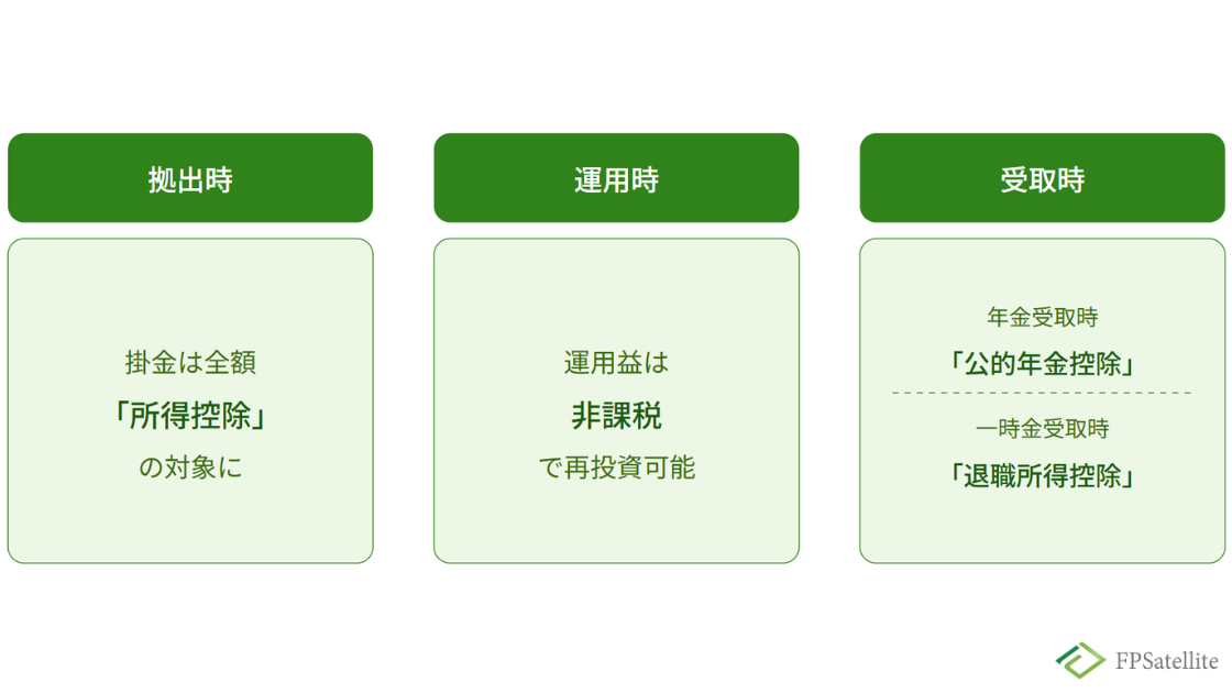 まず掛金は、全額が所得控除の対象になります。そして、制度内で生じた運用益は非課税で再投資される仕組みです。さらに、受け取るときも、一時金で受け取る場合は退職所得控除、年金で受け取る場合は公的年金等控除の対象となります。