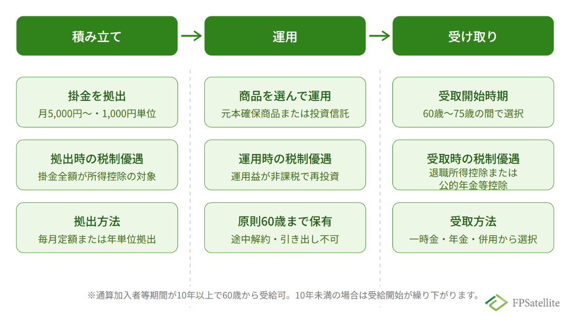 「積み立てる」「運用する」「受け取る」という流れで成り立っており、それぞれの段階で押さえておきたい特徴があります。