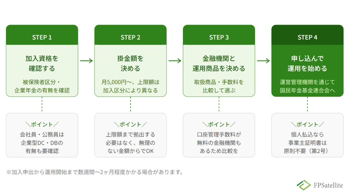 ここでは、iDeCoを始めるまでの基本的な手順を4つに分けて解説します。